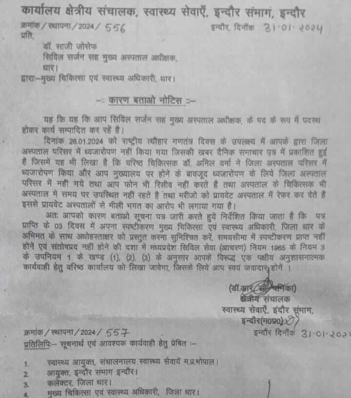 26 जनवरी को राष्ट्रीय ध्वज नहीं फहराने के आराेप में सिविल सर्जन डॉ साजी जोसेफ को मिला कारण बताओ नोटिस। तीन दिवस में मांगा जवाब, संतोषप्रद नहीं होने की दशा…